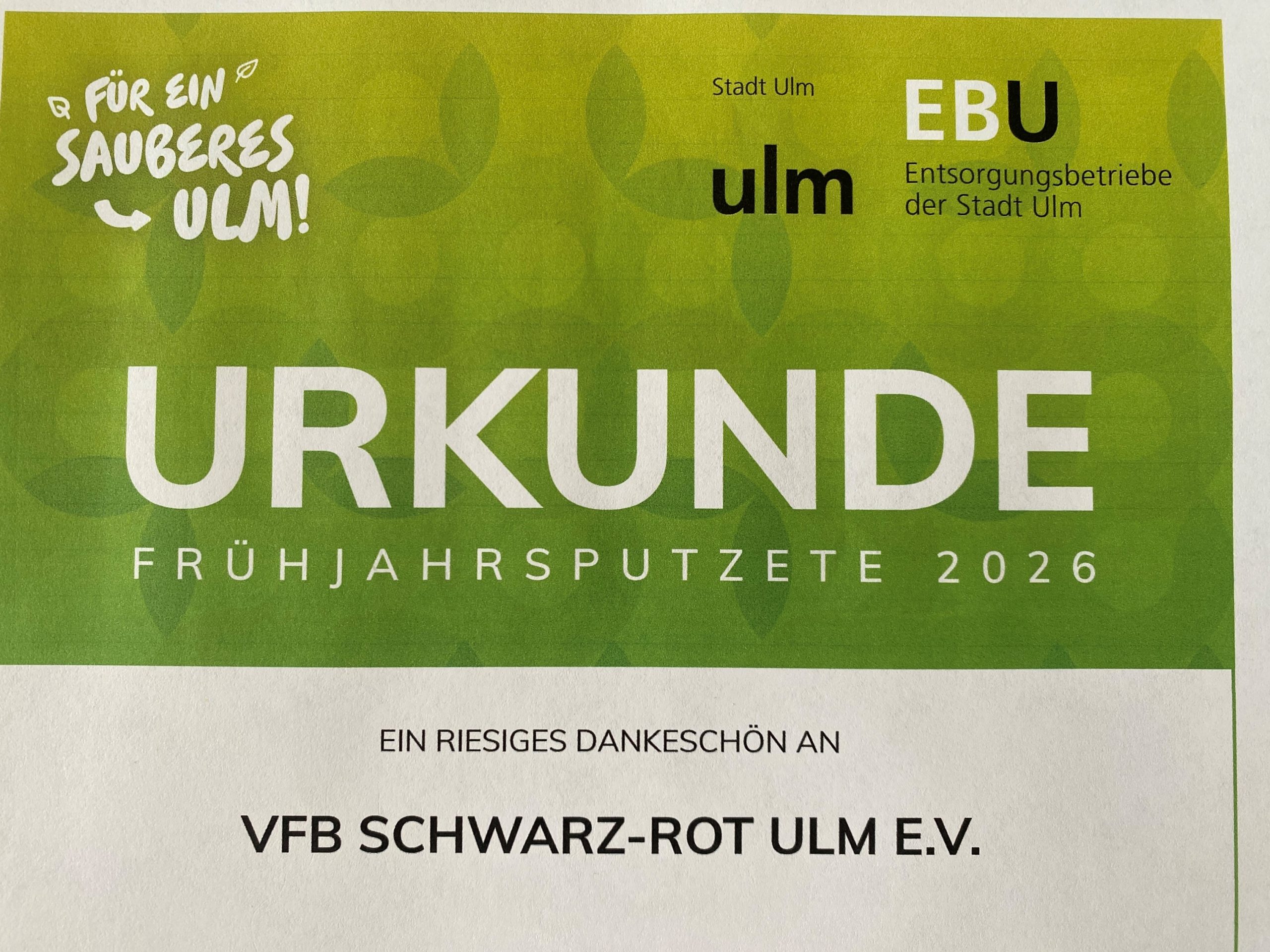 Das ist Eure Urkunde! Von der Stadt Ulm, unterzeichnet von Oberbürgermeister Martin Ansbacher. Sie kam in der Geschäftsstelle bei Vereinsmanager Alex Waldenmaier an, der die Putzete wieder organisiert hatte. Die Urkunde ist ein schöner Ausdruck von Dank und Anerkennung von der Stadt Ulm und ihren Entsorgungsbetrieben für alle fleißigen Hilfsteams aus den VfB Ulm Abteilungen, die sich an der diesjährigen Putzete auf und um das Vereinsgelände beteiligt haben. Auch von der Vereinsführung dafür ein herzliches Dankeschön! Man sieht wirklich überall, wie ihr gewerkelt habt. Für die Sommersaison ist unser Vereinsgelände wieder tiptop.