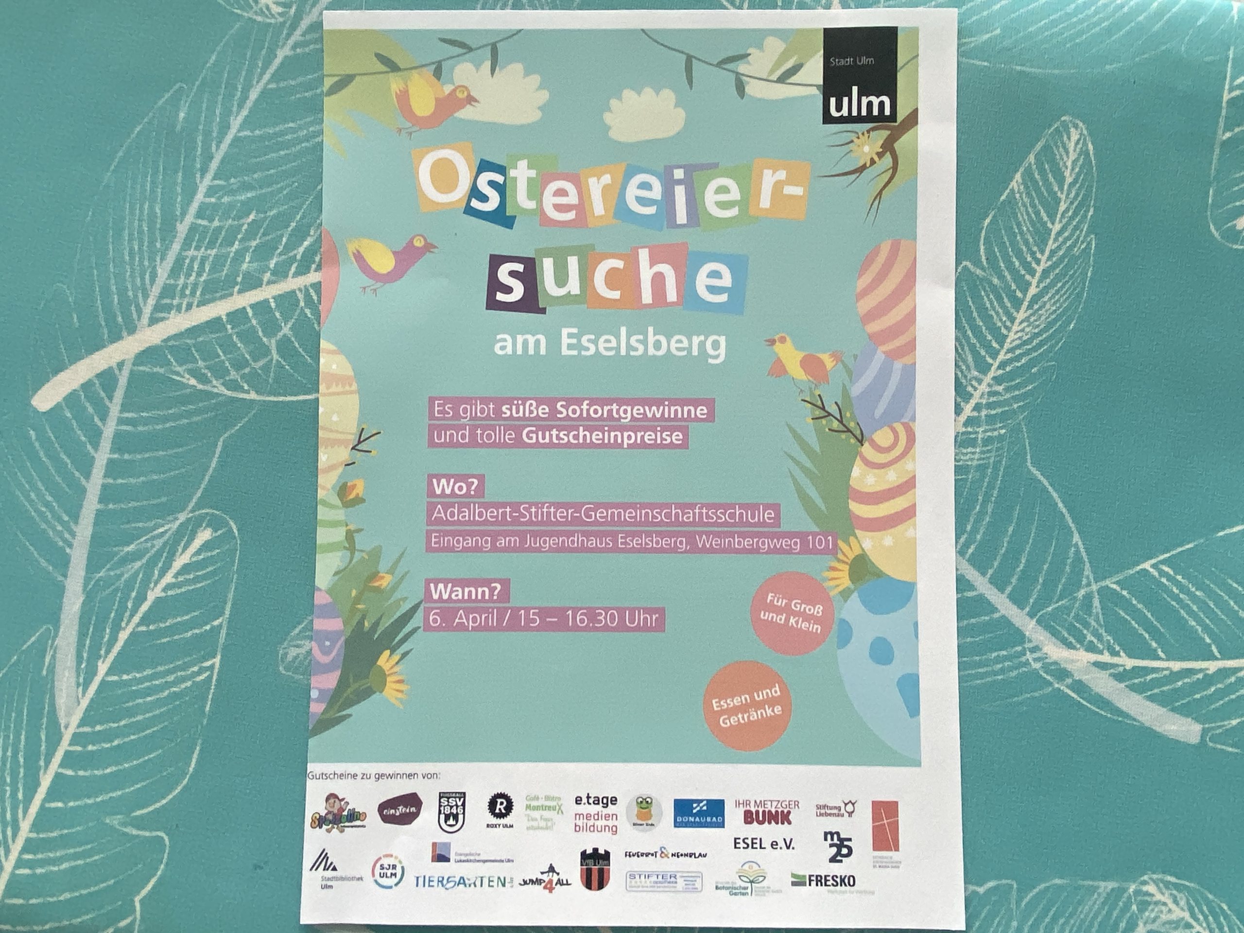 Toller Tipp für den Familien-Osterspaziergang! Am Ostermontag, 06.04.2026, veranstaltet die Stadt Ulm wieder die große Ostereiersuche für alle auf dem Gelände der Adalbert-Stifter-Schule auf dem Eselsberg. Letztes Jahr, bei der Premiere, haben hunderte Kinder und Erwachsene mitgemacht und hatten große Freude bei der Suche. Es gibt süße Sofortgewinne und tolle Gutscheinpreise – wenn man die versteckten Eier findet. Aber Achtung! Der Osterhase kennt schwierige und nicht so schwierige Stellen im Schulgarten als Verstecke…..